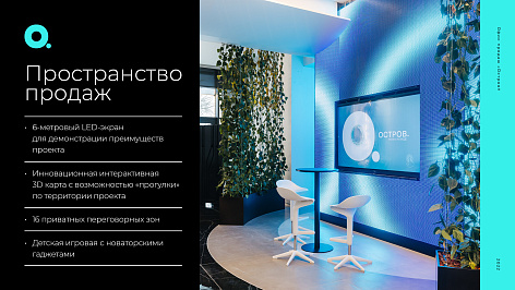 Офис продаж создавался как точка притяжения для клиентов проекта, пространство для погружения в атмосферу будущей жизни на ОСТРОВЕ и, конечно же, как место для заключения сделок.