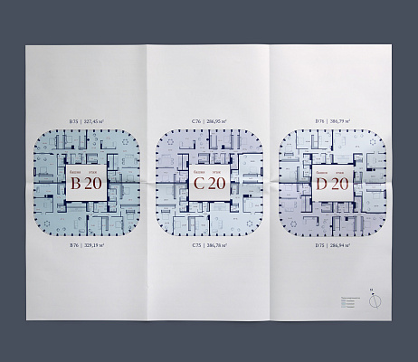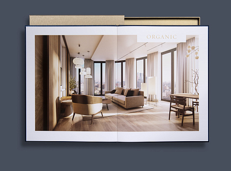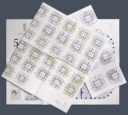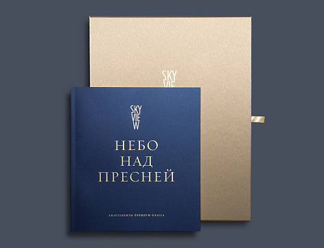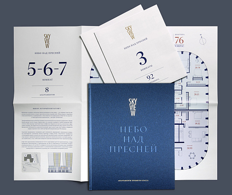 Все идет от функции и от идеи. В архитектуре отсутствует декоративная составляющая — нет излишнего декора и в коммуникационных материалах. Брошюра цвета ночного неба прячется в лаконично роскошной золотой коробке. Небольшая по формату, она, в свою очередь, контрастирует с огромными полноформатными листами-плакатами поэтажных планов. Sky View — это бескрайние виды в огромных окнах просторных квартир, но на условиях приватного, клубного образа жизни.