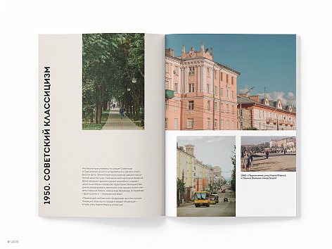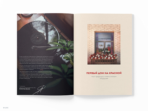 Внутренняя бумага с крафтовым эффектом поддерживает ретро-тематику, которая красной нитью проходит через идею позиционирования дома. В отличии от мелованной глянцевой бумаги, выбранный тип имеет слегка шероховатую поверхность, благодаря чему буклет получился тактильным. Его приятно держать в руке и перелистывать.