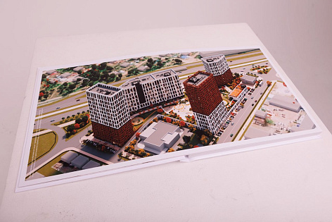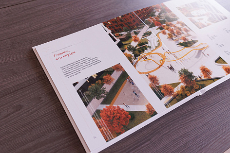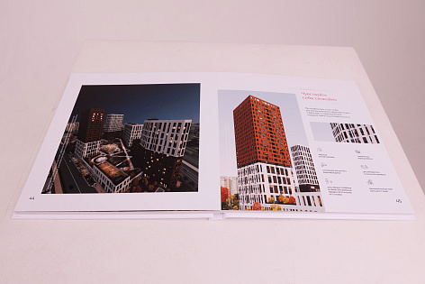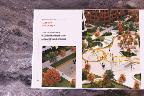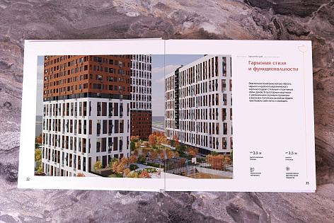 На страницах буклета прослеживается единый текстовый стиль и строгое соблюдение пропорций в дизайне, что позволяет читателю легко воспринимать информацию. Акцент на качественные рендеры жилого комплекса, а текст позволяет создать эффект присутствия. Тексты и изображения, в большей степени влияющие на эмоциональное восприятие, дополнены сухими фактами — краткой инфографикой.