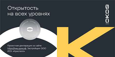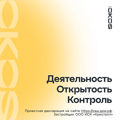 Для замены фонетически нежного и утончённого «Кристалл» мы разработали сильное, звучное и краткое имя OKOS. Его сложно не увидеть, а увидев, не запомнить. Этот ёмкий неологизм на латинице родился из русского слова «око». Ведь строительство — это всегда создание чего-то видимого. Сама компания стремится быть заметной и внимательно смотрит за своими действиями и обещаниями.