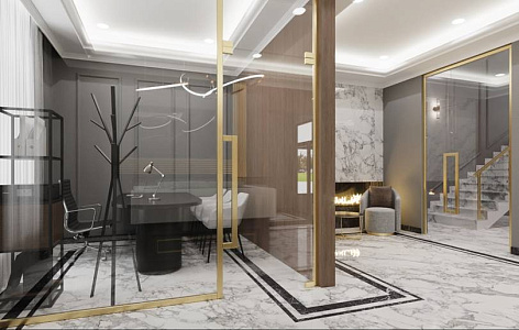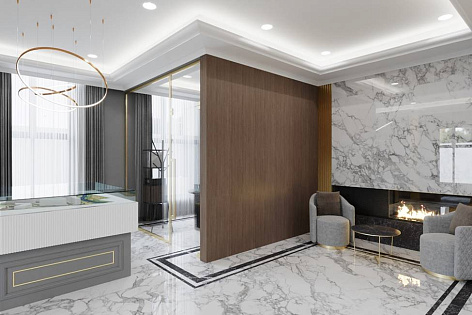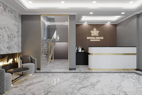 В уютной зоне ресепшн расположена зона с камином, где гости могут представить свою будущую жизнь в Миниполисе 8 кленов и погрузиться в эстетику стиля неоклассицизм.