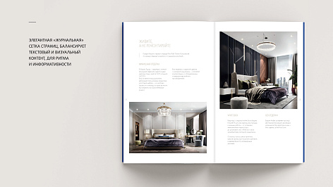 Элегантная «журнальная» сетка страниц, балансирует текстовый и визуальный контент, для ритма и информативности, а красивая инфографика дополняет общую картину.