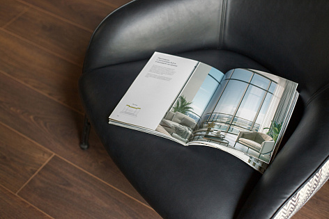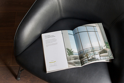 В буклете мы показали современную архитектуру фасадов, особенности благоустройства территории, и самое важное, расставили акценты на компонентах концепции «все включено». На 160 000 кв. м появятся апартаменты и офисы комфорт-класса, улица баров и ресторанов, бьюти-кластер, термы с бассейнами, фитнес-центр 24/7, ТЦ и многое другое. Буклет последовательно повествует об уникальной возможности жить по нажатию кнопки лифта, максимально оптимизируя свое время.