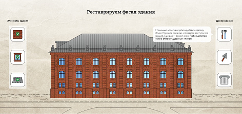 Ключевой элемент проекта – интерактивная игра, где пользователь может примерить на себя роль реставратора и использовать ряд инструментов: от мастерка до выбора визуализации элементов здания (починить крышу, подобрать цвет фасада, добавить пилястры и т. д.).