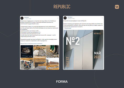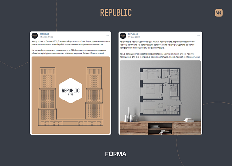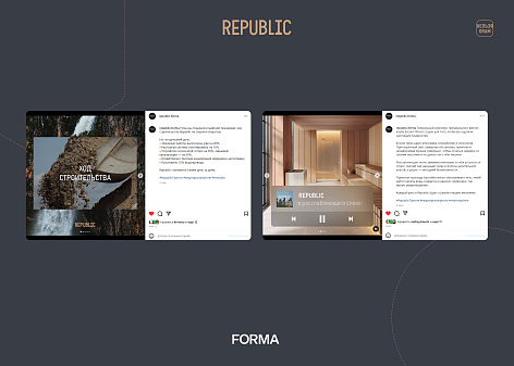 Главная цель проекта: подчеркнуть премиальный имидж Republic в социальных сетях, разработать коммуникационную стратегию, которая будет передавать атмосферу городского квартала, вовлекать аудиторию в диалог и генерировать целевой трафик на сайт бренда.