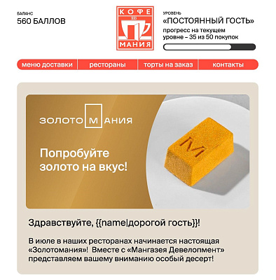 BTL – размещение брендированного десерта «Слиток Золота» во всей сети ресторанов «Кофемания» в Москве и Московской области, вкладка в меню, бренд-мобиль с «золотой» сувенирной продукцией;