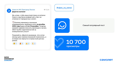 Мы изменили привычное представление о канале управляющей компании. Наша главная цель - изменить подход к ведению чатов УК: в Самолете это не доска с объявлениями об отключении воды и не рекламный баннер с услугами по подключению кондиционеров. Это полезные статьи об интерьере, интервью с интересными соседями, вдохновляющие подборки видео, музыки и фото, конкурсы и прочие посты, которыми хочется делиться.