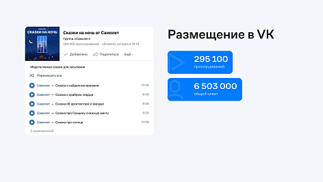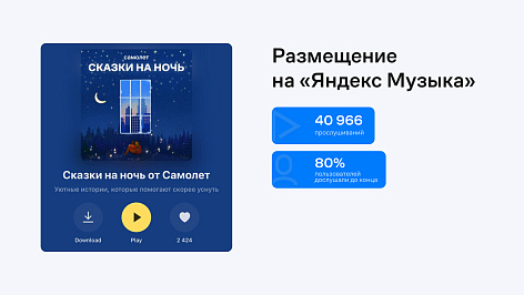 Мы нашли пользователя там, где он расслабляется, и дали ему максимально релевантный и полезный брендированный контент. 80% пользователей дослушали сказки до конца — а, значит, что они точно услышали имиджевое сообщение группы «Самолет».