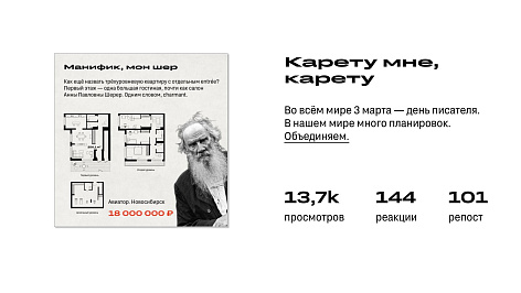 Сейчас у нас 11,5 тыс. подписчиков, и это самый большой телеграм-канал застройщика со штаб-квартирой не в Москве и Санкт-Петербурге. Нас как-то назвали Авиасейлсом в мире недвижимости. Это нам льстит и мотивирует креативить дальше. Остальное — в презентации.