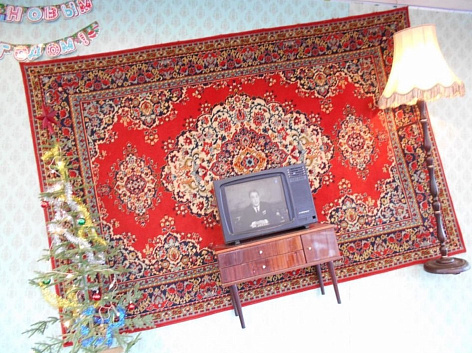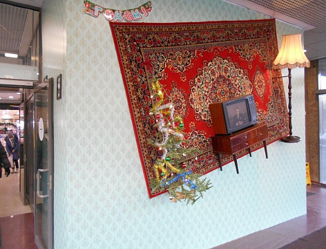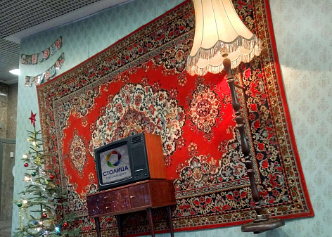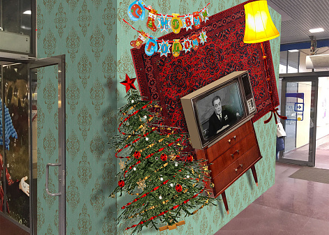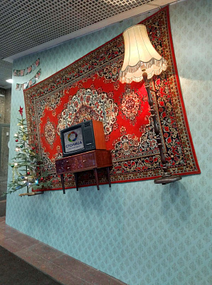 Ретро-уголок отсылает нас во времена детства, в котором мы выросли и всегда вспоминаем с теплыми чувствами. Главные ретро новогодние атрибуты обычной советской семьи - новогоднее выступление Генерального секретаря ЦК КПСС, ковер, и аутентичная елка, которая в те времена не отличалась пышностью и шикарным убранством. Для брендирования зоны была организована трансляция логотипа торгового центра после каждого выступления Генерального секретаря.