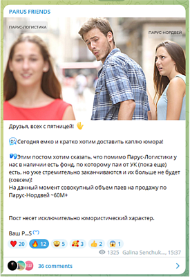 Мы часто используем мемы, в ответ на это мы получаем мощный отклик от нашей аудитории. Все обсуждают, смеются и начинают создавать мемы про ЗПИФы самостоятельно, тем самым поддерживая friendly-обстановку среди инвесторов и формируя дружное сообщество единомышленников.