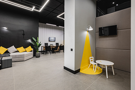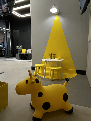 Офис продаж включает в себя: объемную входную группу с велопарковкой и стелой. Зонирование самого офиса предусматривает трансформируемые зоны для совещаний, кабинеты менеджеров, комнаты для переговоров, уютные зоны для ожидания, детскую игровую комнату и интерактивный макет жилого квартала с подсветкой здания и движущимися машинками.