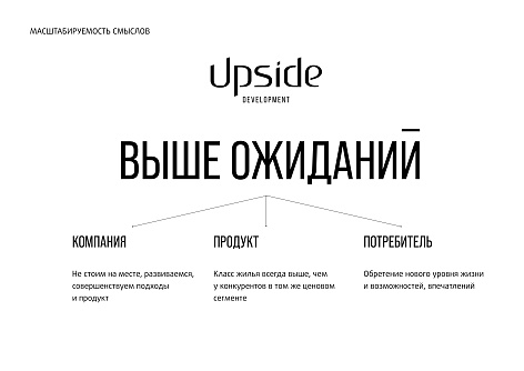 Базируясь на высоких стандартах качества, технологических решениях, комфорте и безопасности, компания каждый раз создает уникальный Upside-проект, повышающий верхнюю границу класса, развивающий локацию, каждый раз инновационный, превосходящий ожидания клиента