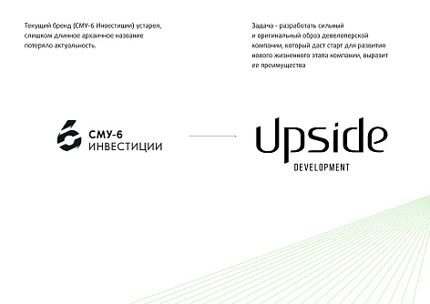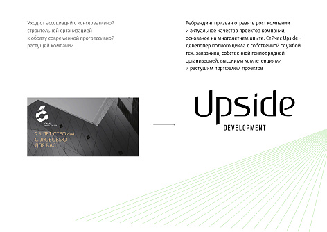 Ребрендинг призван отразить рост компании и актуальное качество проектов компании, основаное на многолетнем опыте. Сейчас Upside - девелопер полного цикла с собственной службой тех. заказчика, собственной генподрядной организацией, энергичной командой