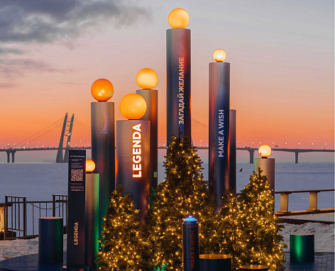 Бренд-зона MAKE A WISH демонстрирует гармоничное сочетание архитектуры городского ландшафта и праздничной атмосферы. Визуальным вдохновением стали контуры городских горизонтов, разноуровневых высоток и стремящихся в небо труб, а также форма свечей, которые традиционно считаются символами домашнего уюта и маяками желаний в праздничный сезон.