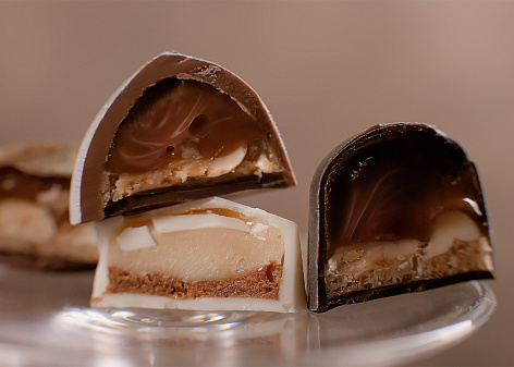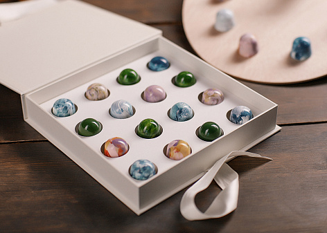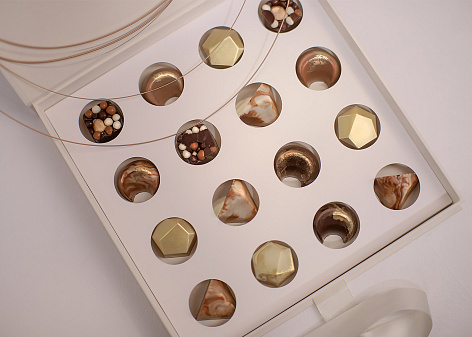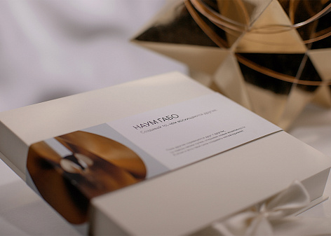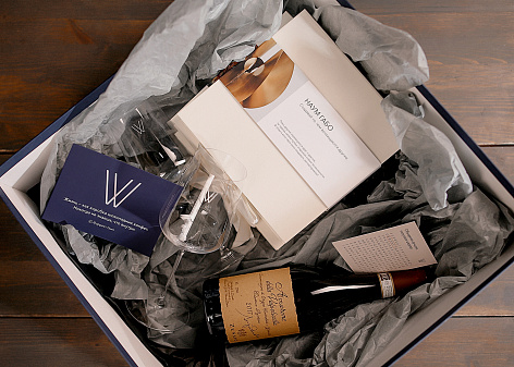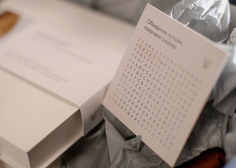 Сувенирная продукция в виде подарочного набора для клиентов отражает концепцию искусства проекта. Набор конфет, как олицетворение трех направлений творчества великих маэстро, хорошее красное вино с имиджевым фужером и игра для разминки ума — то, что точно не ожидает получить клиент после подписания договора купли-продажи.