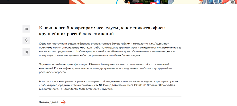 Идея: «достучаться» до ЦА через компании, которые являются top-of-mind в своих секторах, и вовлечь их в проект через чувство гордости. Так родилась идея первого рейтинга штаб-квартир крупнейших российских компаний.