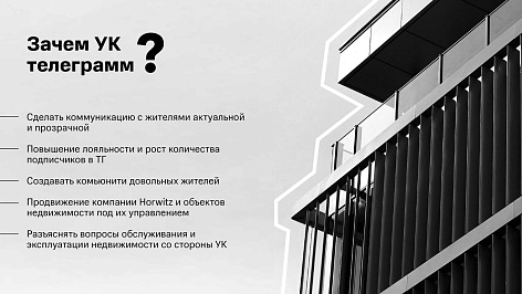 Целью коммуникации является продвижение компании Horwitz и объектов недвижимости под их управлением, рост количества подписчиков Телеграм-канала и их лояльности, развитие сообщества жителей.