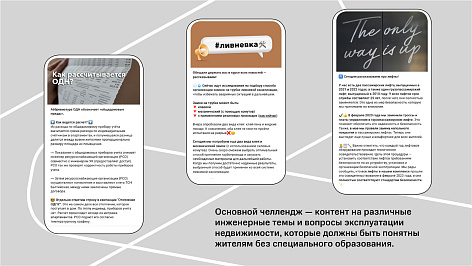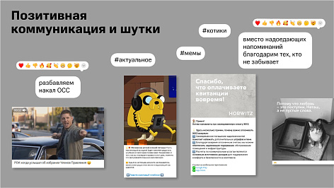 Миксуем образовательный контент про ОДН, квитанции, налоги, инженерные коммуникации с мемами/шутками и социально важными темами про осознанное потребление, добрососедство. Все, как в жизни.