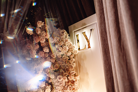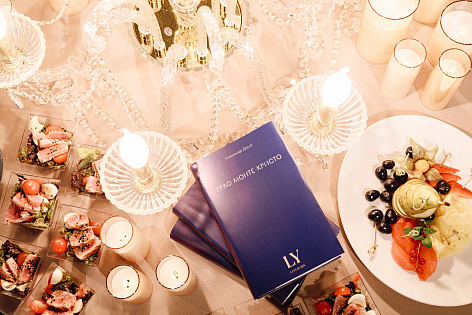 - фуршетная линия с закусками и напитками для гостей, декорированная свечами, хрустальными люстрами, книгами классиков с логотипом объекта и флористическими композициями;
