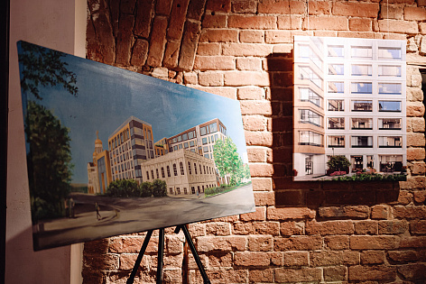 - в центре зала располагалась картина, написанная специально для мероприятия художницей из Екатеринбурга. На ней был переосмыслен основной рендер объекта.