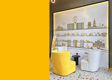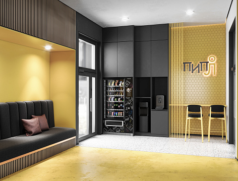 Первый этаж: лобби, кофейня, лапомойка, библиотека, коворкинг, детские игровые.