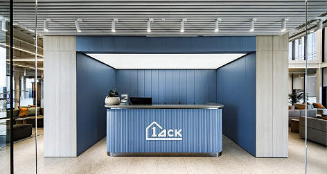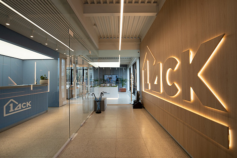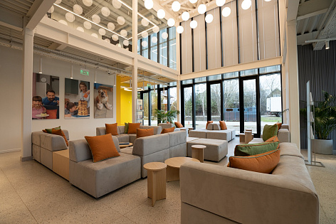 Цвета, использованные в интерьере офиса свежие, яркие и одновременно мягкие. В зоне входной группы предусмотрена круглосуточная подсветка логотипа, в зоне ресепшен установлена стойка в соответствии с концепцией проекта. Декоративные элементы, растения в напольных кашпо и яркие постеры на стенах завершают позитивное настроение интерьера, даря незабываемое яркое впечатление.