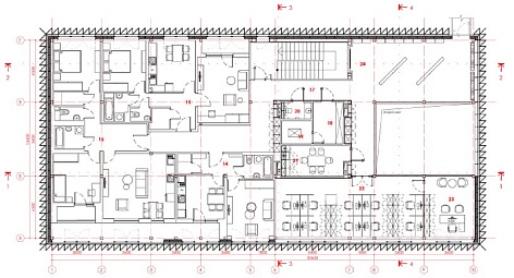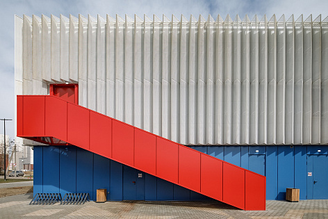 Изюминкой стала красная лестница, которая напоминает нам об эпохе конструктивизма. Большие окна делают офис светопроницаемым.