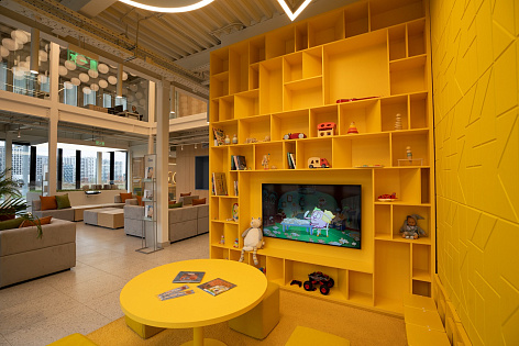 Дизайн детской комнаты соответствует дизайну офиса продаж 1-й Донской. Невероятно солнечная детская зона в желтых тонах дарит тепло всем посетителям круглый год.