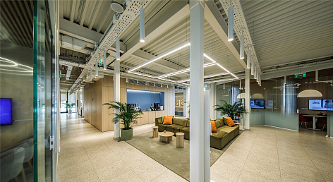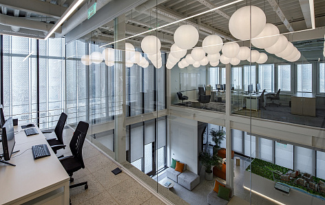 Демократичное светлое пространство офиса имеет два этажа.