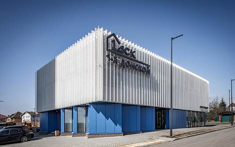 Фасад офиса лаконичный, парадно сочетает в себе синий цвет панелей с легкой фактурной сеткой белого цвета, опоясывающей весь второй этаж по периметру.