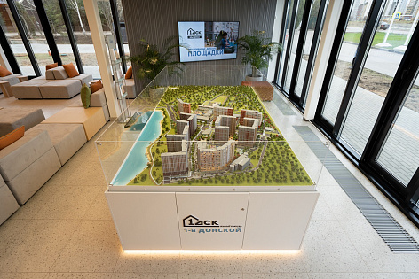Макет оснащен планшетом, на котором можно выбрать любую квартиру и подсветить ее, чтобы увидеть, где именно она будет находится относительно корпуса и ЖК в целом. Также на макете удобно показывать как общие виды ЖК, так и частные детали фасадов, всю запланированную инфраструктуру и наполнение дворов.