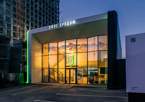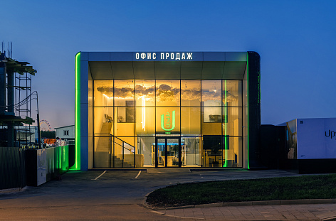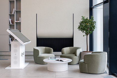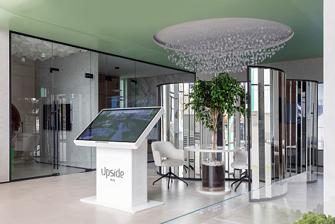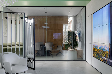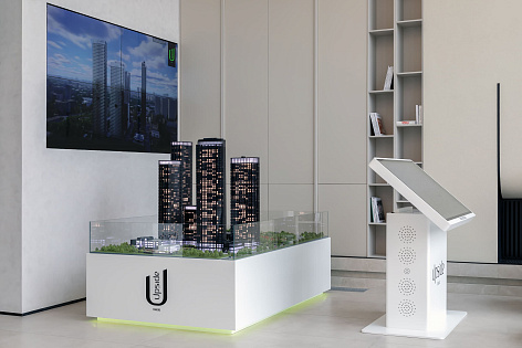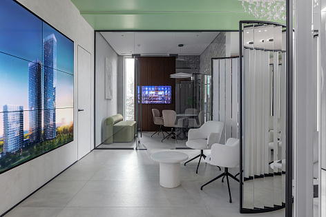 Общий дизайн-код офиса продаж построен на сочетании максимально натуральных и экологичных материалов с сохранением природной фактуры. Оборудование офиса: тончайшие смарт-панели, «умный» макет и цифровой двойник сверхквартала. В офисе продаж также открыт шоу-рум квартиры. Для клиентов представлена однокомнатная квартира с отделкой.