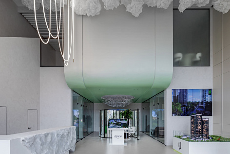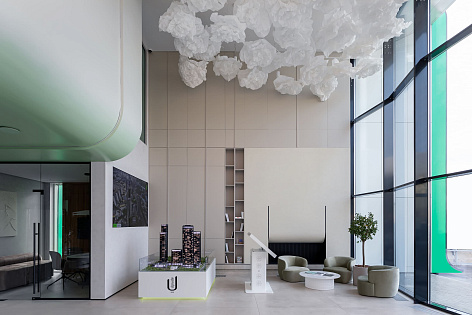 «Сердце» нашего офиса продаж – просторное лобби c высоким потолками и арт-инсталляцией из горных облаков.