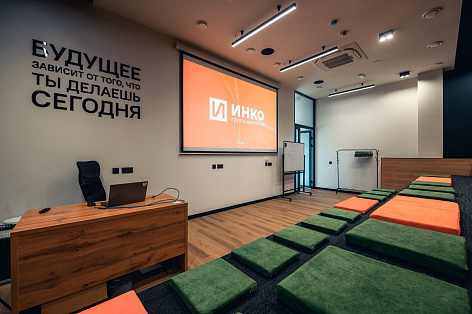 На втором этаже расположен конференц-зал. Здесь проводят мероприятия партнеры и сотрудники компании: презентации, конференции, обучения, стратегические сессии. Кровля здания – эксплуатируемая, с нее открываются виды на объекты ИНКО.