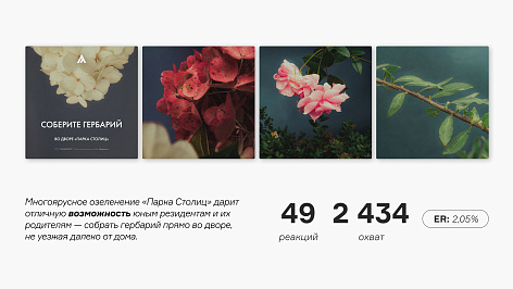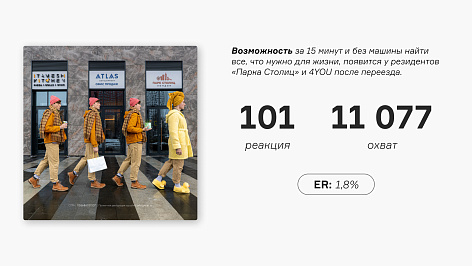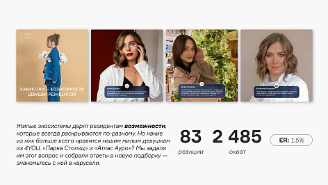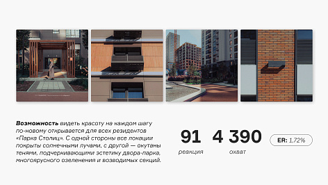 Подчеркнуть идею нам помог чудесный подход Уэса Андерсона, который мы использовали в визуальной репрезентации проекта. Но речь не о копировании, а о вдохновении симметрией кадров и вниманием к деталям, которые могут быть красноречивее слов. Мы не стали уводить визуалы в яркие цвета, а отдали предпочтение естественным краскам. Но все это не сработало так эффективно, если бы мы не ввели в коммуникацию реальных людей: снимаем с резидентами стилизованные видео и фото, рассказываем их истории в публикациях.