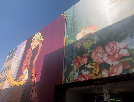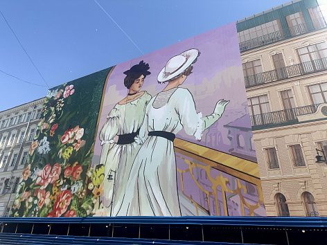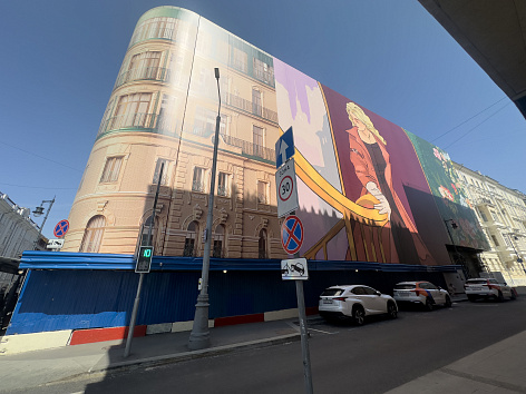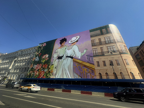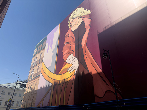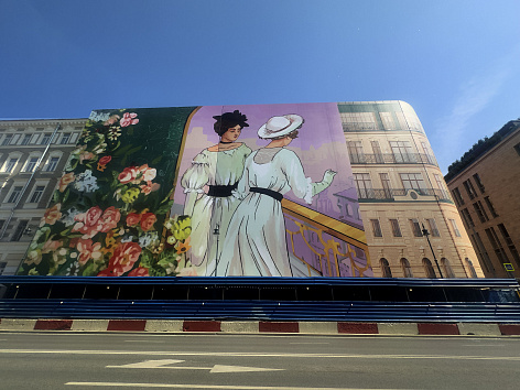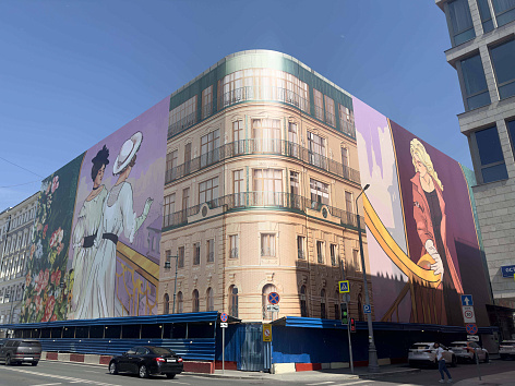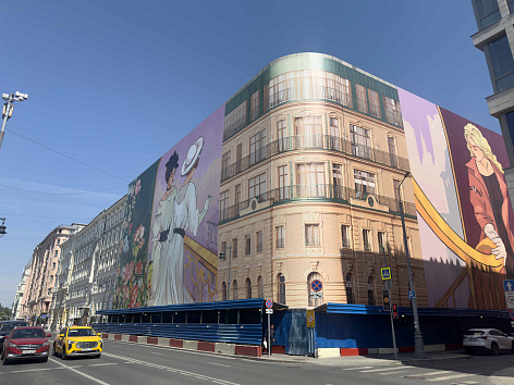 Концепция хординга была разработана известным московским художником - Григорием Масленниковым. Идея слияния двух времен олицетворяется образами двух дам, которые встретились друг с другом в Доме на Остоженке.