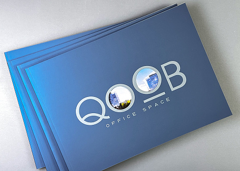 Внешний вид буклета отсылает к облику бизнес-центра. QOOB – это симбиоз стекла и металла, динамика линий фасада и зигзагообразного конструктива, визуальная легкость. За счет витражного остекления внутреннее пространство бизнес-центра наполняется воздухом и светом.