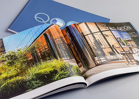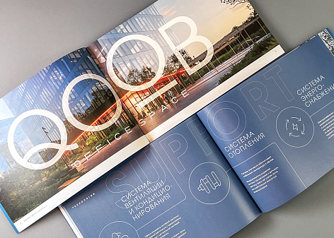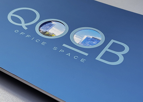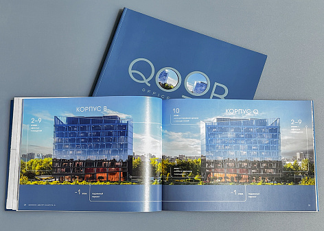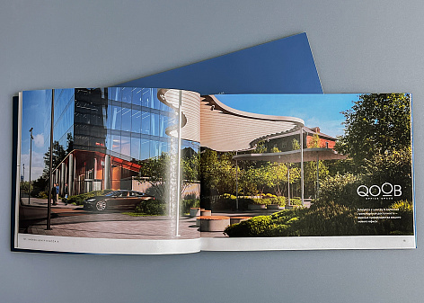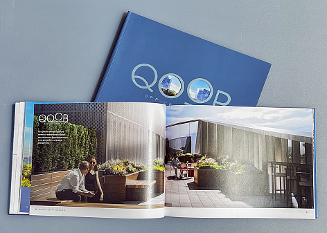 Взяв за основу зеркальное расположение корпусов бизнес-центра, мы интегрировали логотип QOOB в обложку и сформировали запоминаемость бренда в привязке к архитектуре. Выбранный нами альбомный формат удачно представляет форму двух равнозначных зданий.