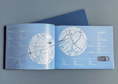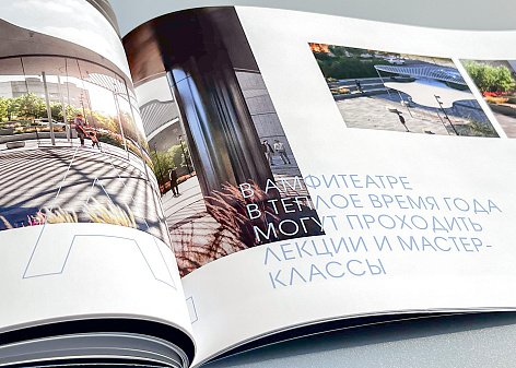 Эти особенности мы постарались передать через цветовые и технологические решения печати. Сетка верстки имеет много воздуха. Основные цвета – оттенки синего, голубого и серого. Блеск металла передан за счет использования металлизированных пантонов. Контурность шрифтовых решений буклета подчеркивает легкость конструкций зданий.
