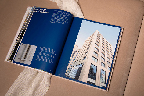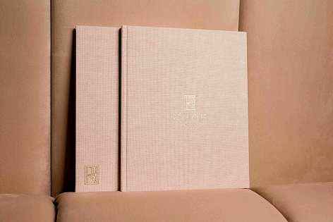 При создании буклета мы руководствовались следующей идеей - объединить тактильное и визуальное ощущения в синергию роскоши и премиальности. Визуально буклет напоминает книгу из редкого собрания. На тканевой обложке выполнено тиснение золотой фольгой, а внутренний блок - из бумаги высочайшего класса.