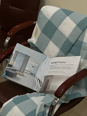 Тема воды вшита в бренд проекта, она читается и в неймиге (river+Angara), и в айдентике, и в архитектуре и фасадах клубного дома, где балконы сделаны в виде волны, а цвет фасада созвучен с цветом воды. Сувенирная продукция тажке выполнена в теме реки: зеркальная обложка буклета олицетворяет водную гладь, паттерн волны и цветовая гамма созвучны той же тематике. А что понадобиться резиденту клубного дома для счастливой прогулки у воды? Конечно уютный плед, горячий чай и любимый человек рядом!