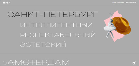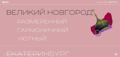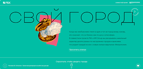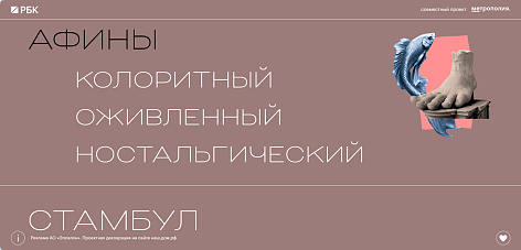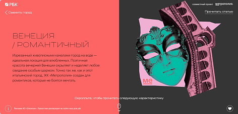 Предлагаем пользователям познакомиться с «вайбами» различных городов и выбрать ту локацию, которая им ближе всего по духу. Всего в проекте рассказали про 10 локаций — Владивосток, Великий Новгород, Екатеринбург, Санкт-Петербург, Амстердам, Барселона, Афины, Стамбул, Сингапур и Венецию. Города выбрали не случайно: в честь каждого из них названы корпуса жилого комплекса «Метрополия».
