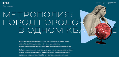 В проекте важно было подчеркнуть, что «Метрополия» — это микс из образов жизни самых прогрессивных городов планеты. Совместно с подразделением Specialists компании РБК провели параллель между эталонными примерами городской среды мировых мегаполисов и прогрессивным жилым комплексом «Метрополия».