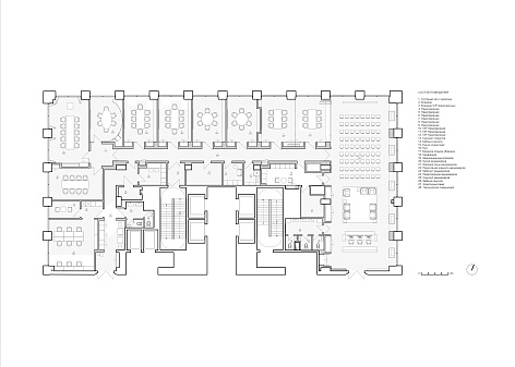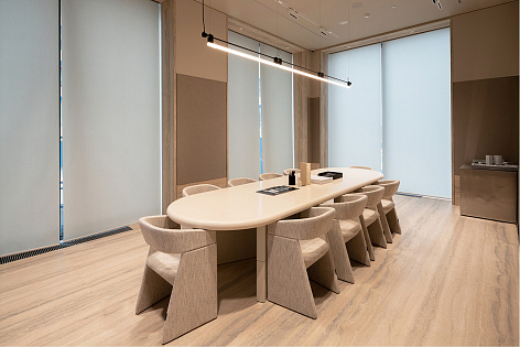 В проекте предусмотрено 9 переговорных разного формата, в том числе переговорные для ежедневного использования и вип-переговорные с индивидуальным оформлением, которые подойдут как для камерных встреч, так и для масштабных мероприятий. Офис также оснащён фриворкинг-зоной. Ключевым элементом этой зоны является шеринг-стол — универсальное рабочее место, за которым не закреплены сотрудники, где любой гость может сосредоточиться на своих задачах.