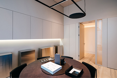 Другая особенность пространств Дома продаж — их мультифункциональность. KEMELIN PARTNERS спроектировали пространство с помощью адаптивных мебельных, световых и акустических решений — при необходимости можно обустроить зоны для клиентских мероприятий, вечеров программ лояльности, кейтеринга, лекций и выставок.
