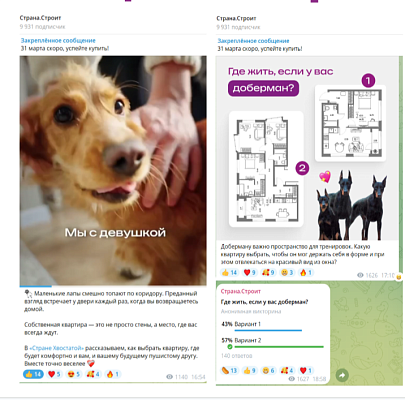 65% от всего количества публикаций в социальных сетях были органическим! Из рекламных сообщений мы вели на сайт проекта, где разместили карточки с полезной информацией о том, как организовать в квартире счастливую жизнь с питомцем, какие площади и планировки подходят разным породам собак, а также рассказали о наших собачьих площадках.
