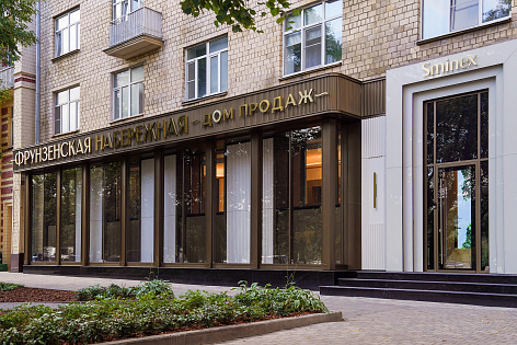 В отделке дома продаж Sminex использовал материалы, которые выбрал для строительства самой «Фрунзенской набережной»: натуральный мрамор, дерево, латунь, моллированное — изогнутое — остекление. Детали витражного парка квартала воплощаются в зелёных оазисах дома продаж.