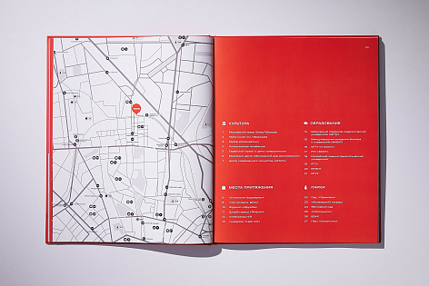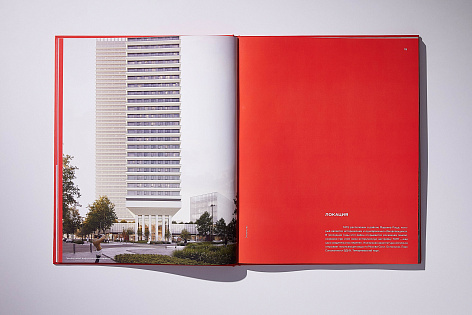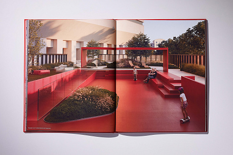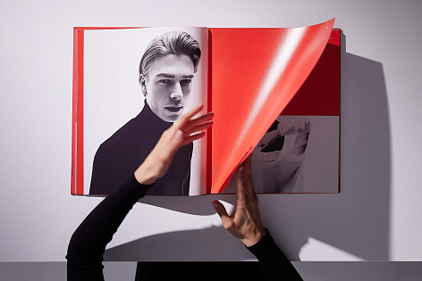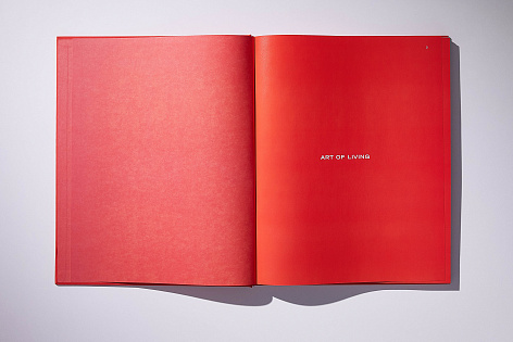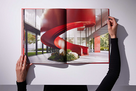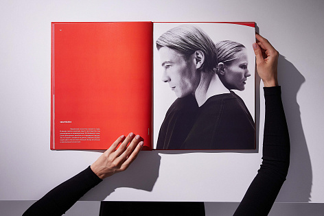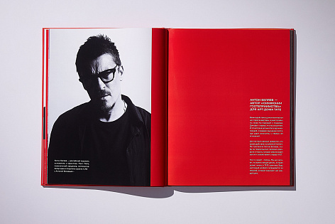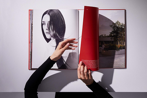 Каждая разворотная композиция построена как курация: герметичная верстка, выразительные монохромные портреты, парадоксальные ракурсы архитектуры и свободное обращение с пространством пустоты. Цветовая доминанта — глубокий красный — превращает книгу в художественный объект.